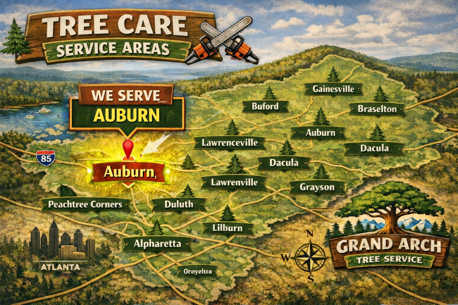 Grand Arch Tree Service proudly provides professional tree care services in Auburn, GA, helping homeowners maintain safe, clean, and well-maintained properties. As Auburn continues to grow, proper tree care is essential for protecting homes, improving curb appeal, and keeping outdoor spaces functional and safe.
